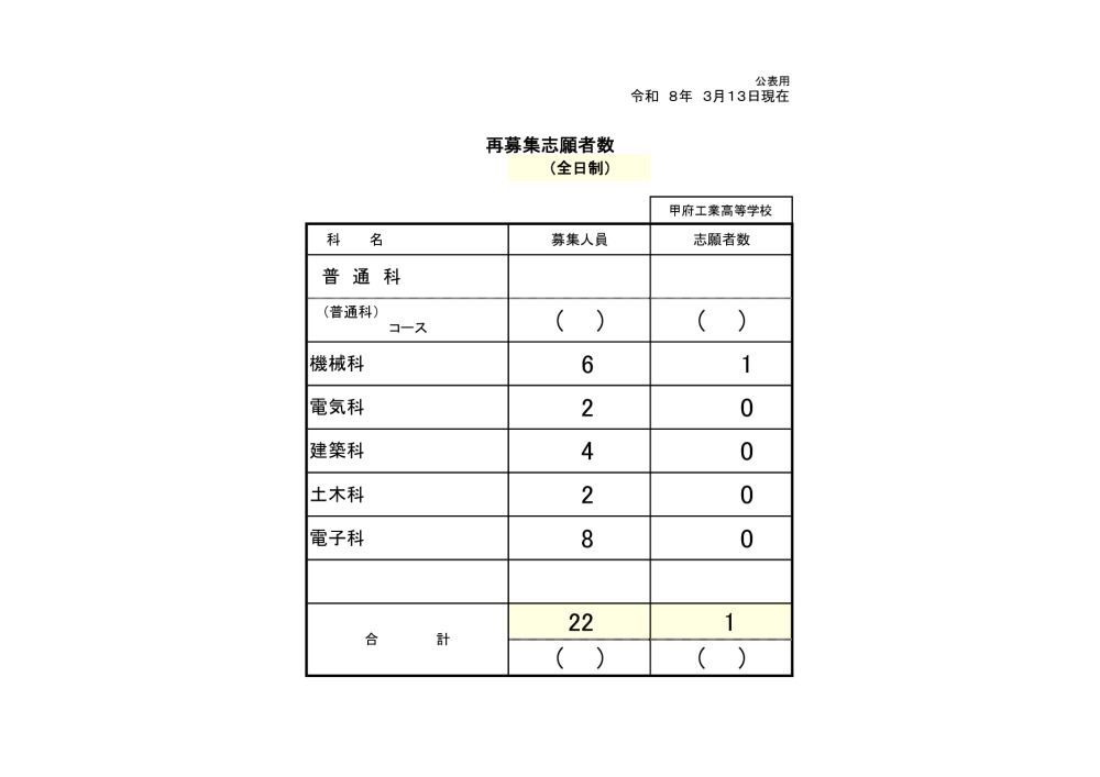 NEW 2025/07/04更新 各種支援金について (2023/03/13~) URLが https://www.kofu-th.ed.jp/ に変更になりました 【保護者のみなさまへ】出席停止関係の提出書類はこちらを開いてください NEWS 一覧ページへ→トピックス学校から 掲載順(すべて) トピックス 学校から 緊急連絡なし 2026年3月13日 トピックス 3月13日現在 再募集志願者状況 2026年3月12日 学校から 令和8年度入学許可予定者受検番号一覧 2026年3月2日 専攻科 令和8年度会計年度任用職員の募集(創造工... 2026年3月2日 事務室より 令和8年度採用会計年度任用職員募集要項に... 2026年2月24日 学校から 志願変更2日目 2026年3月13日 トピックス 3月13日現在 再募集志願者状況 2025年12月12日 専攻科 創造研究発表会ページを更新しました 2024年9月18日 トピックス 第2・3回 女性部会 9/18 11/1... 2024年5月14日 トピックス 令和7年度入学者選抜学校説明会について(... 2024年4月4日 トピックス 令和6年度入学式のご案内 2026年3月12日 学校から 令和8年度入学許可予定者受検番号一覧 2026年3月2日 事務室より 令和8年度採用会計年度任用職員募集要項に... 2026年2月24日 学校から 志願変更2日目 2026年2月20日 学校から 志願変更1日目 2026年2月17日 学校から きかい科便りNo.58 緊急連絡はありません。 PICK UP 一覧ページへ→部活動ほっとニュース 掲載順(すべて) 部活動 ほっとニュース 2026年3月13日 卓球 卓球部通信第129号 2026年3月3日 生徒会本部(企画実行) 生徒会誌「五葉」 2026年3月1日 卓球 卓球部通信第128号 2026年3月1日 ほっとニュース 卒業証書授与式 2026年3月13日 卓球 卓球部通信第129号 2026年3月3日 生徒会本部(企画実行) 生徒会誌「五葉」 2026年3月1日 卓球 卓球部通信第128号 2026年2月16日 卓球 卓球部通信第127号 2026年3月1日 ほっとニュース 卒業証書授与式 2026年3月1日 ほっとニュース 表彰式・校納式 2026年1月9日 ほっとニュース 鏡開き 2026年1月9日 ほっとニュース 3学期始業式