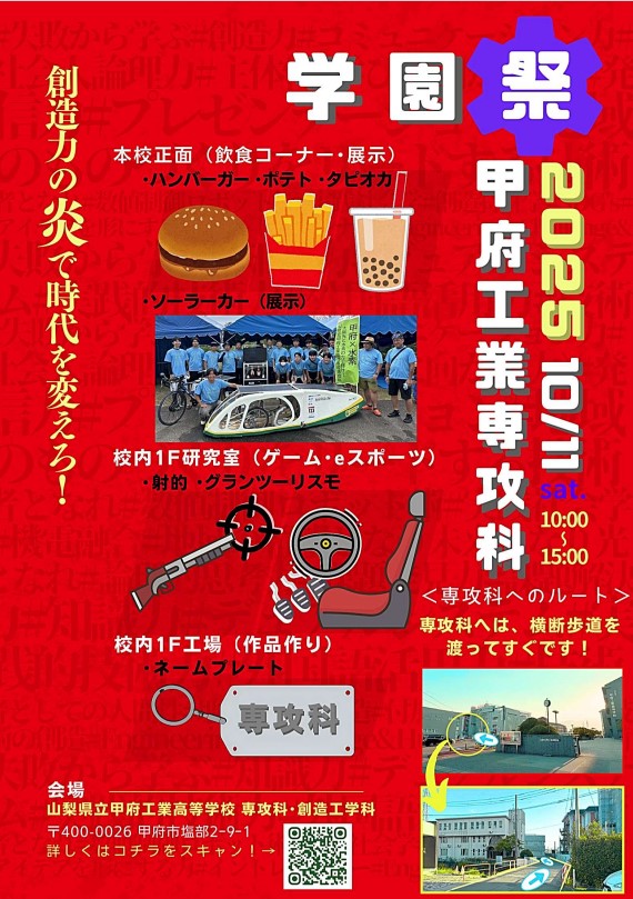専攻科ニュース > 2025年 2025年 1 / 812345...»最後 » 学園祭が実施されました 2025年10月11日 17:46 高校本科の学園祭に合わせて、専攻科創造工学科でも学園祭を開催しました。 当日は、射的ゲーム、創造工学科の学科説明、モノづくり体験、eスポーツ体験、模擬店など、さまざまな企画を実施し、大変多くの皆様にご来場いただきまして専攻科の魅力を伝えることができました。 ご来場いただいた皆様、誠にありがとうございました。 後期の授業がスタートしました 2025年9月29日 18:32 夏休みが終わり、専攻科創造工学科の後期の授業が始まりました。 2年生は今後は創造研究に打ち込みます。デュアルシステムの要の一つである内定先企業との共同研究など、専攻科生活を締めくくる大事な学期となります。 1年生は通常の授業に加え、こちらもデュアルシステムの一環としての企業実習に取り組みます。 本日は後期の始まりとして、放課後に全体集会が行われました。 永田総括主任から訓話や、学生代表による1分間スピーチ、今月の目標の発表などがおこなわれ、全員が後期に向けて気持ちを新たにしました。 10月11日(土)学園祭について 2025年9月26日 15:56 専攻科創造工学科でも学園祭を実施します。 ぜひお越しください。 Youtube番組で紹介されました 2025年9月16日 09:32 CAMソフトのMastercamの導入の際にお世話になりましたジェービーエムエンジニアリング株式会社様のYoutubeチャンネルで本校の取り組みについてご紹介いただきました。 動画へのリンクはこちら この工業高校がスゴイ!Mastercamとともに自由な発想で、未来を切り出す。【山梨県立甲府工業高等学校 専攻科創造工学科】【ユーザー訪問/事例紹介】|ジェービーエムエンジニアリング株式会社 また、Web記事でもご紹介いただいております。 Web記事へのリンクはこちら Mastercamとともに自由な発想で、未来を切り出す。 企業実習事前指導 2025年9月11日 13:50 当科の目玉カリキュラムのひとつ「デュアルシステム」の主要な取り組みとなる1年生の「企業実習」が後期より始まります。 これに先立ちまして、事前指導が行われました。 今後の就職試験までの流れの説明のあと、学生から各企業へのメールを送信しました。先生方より丁寧な指導を受け、慣れないビジネスメールについて実際に書きながら学ぶことができました。 後期の「企業実習」を通じて、学生たちがどのような学びを得て、どのように変化していくのか その成長がとても楽しみです。 1 / 812345...»最後 »