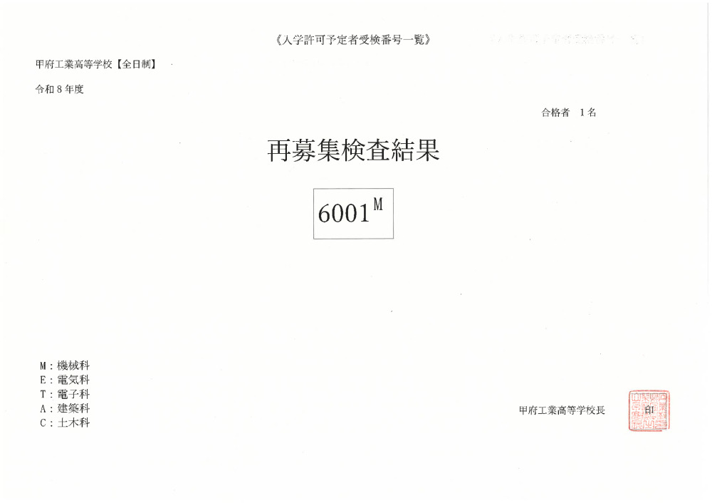 令和8年度再募集入学許可予定者受検番号一覧