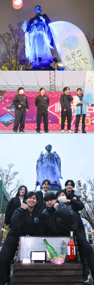 日邦プレシジョン様の技術支援を受け、チームが製作した水素燃料電池式発電機を用いて、会場の武田信虎公像を青色にライトアップしました。